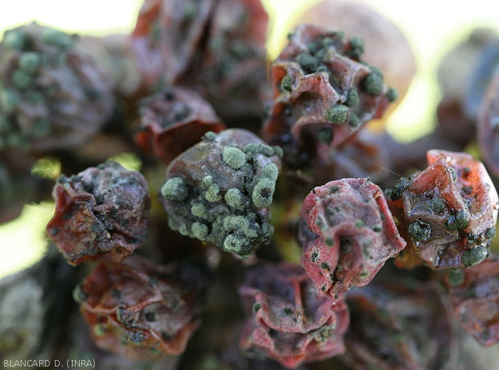 Se forma una esporulación de aceituna en la superficie de las bayas, formada por abundantes conidióforos portadores de numerosos conidios. Esta esporulación puede cubrir más o menos completamente las bayas (figuras 3 a 5) o estar más bien localizada en forma de almohadillas de esporas (figuras 6 a 8).