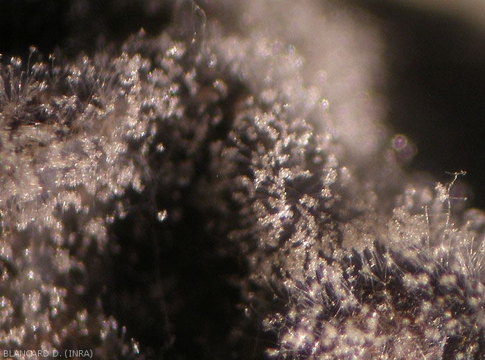 Los conidióforos de Trichothecium roseum están muy poco diferenciados y miden más de cien micrones de longitud. Solo se notan cuando se producen los conidios (Figuras 1 a 5).