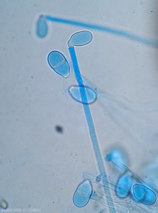 Los conidios son hialinos (pero de masa rosada) y bicelulares, mostrando un solo tabique. Su pared es bastante lisa y gruesa. Son cilíndricos o en forma de pera, miden 13-27 x 8-11 µm y tienen una base estrecha con una cicatriz oblicua (Figuras 5 y 6).