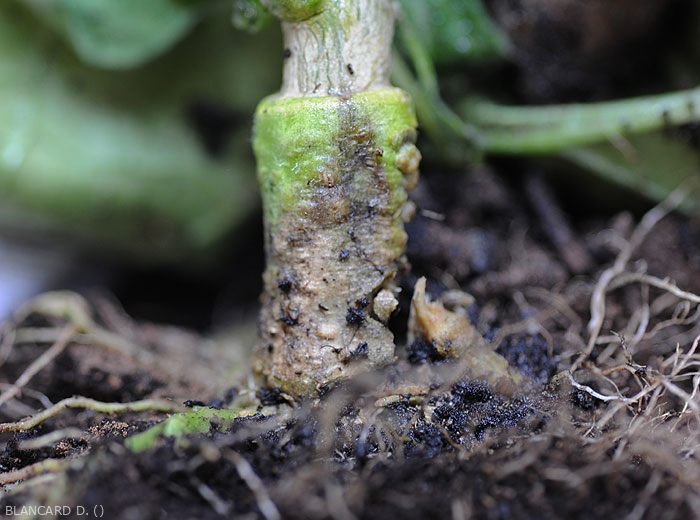 - Las lesiones húmedas inicialmente de color verde oscuro rodean gradualmente el cuello, volviéndose gradualmente marrones y necróticas.