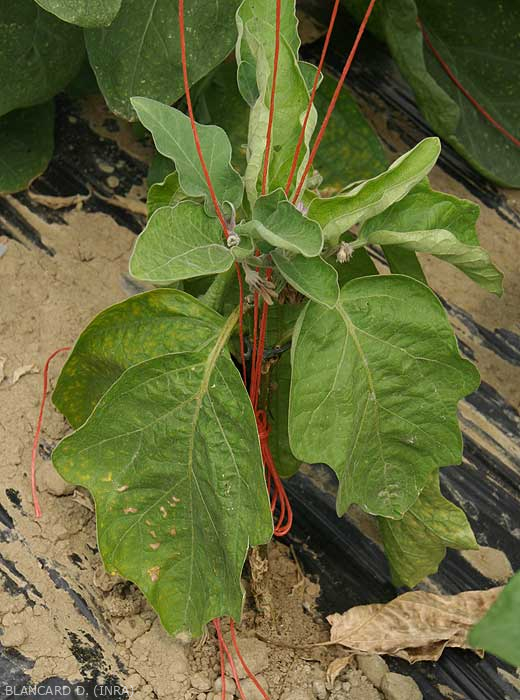 Signos : Presencia de pequeñas cúpulas cónicas terrosas en la base de los tallos de berenjena.