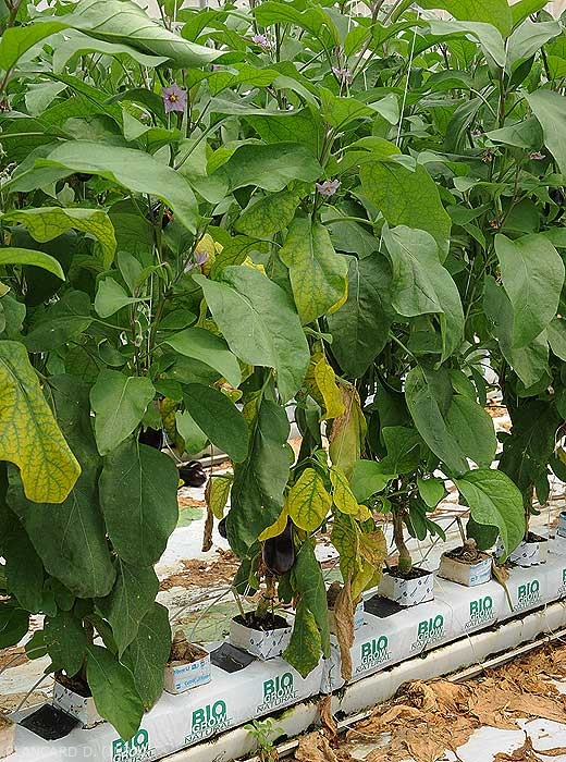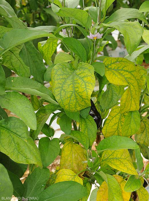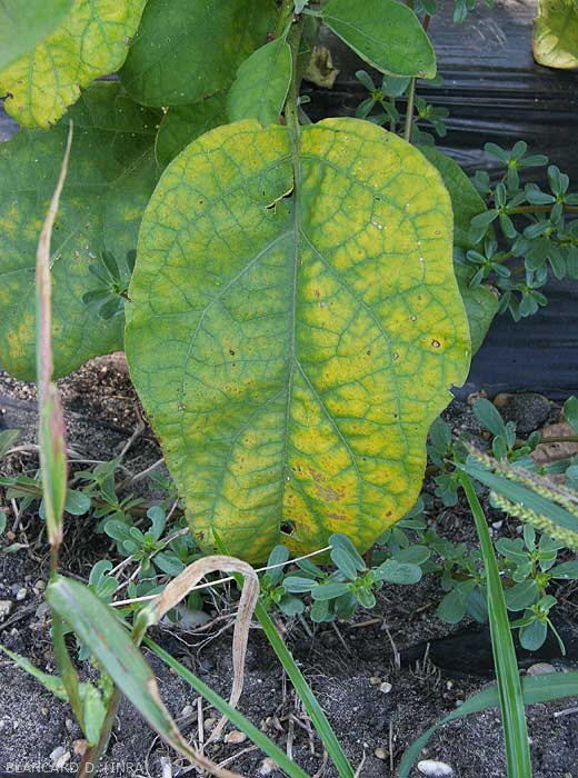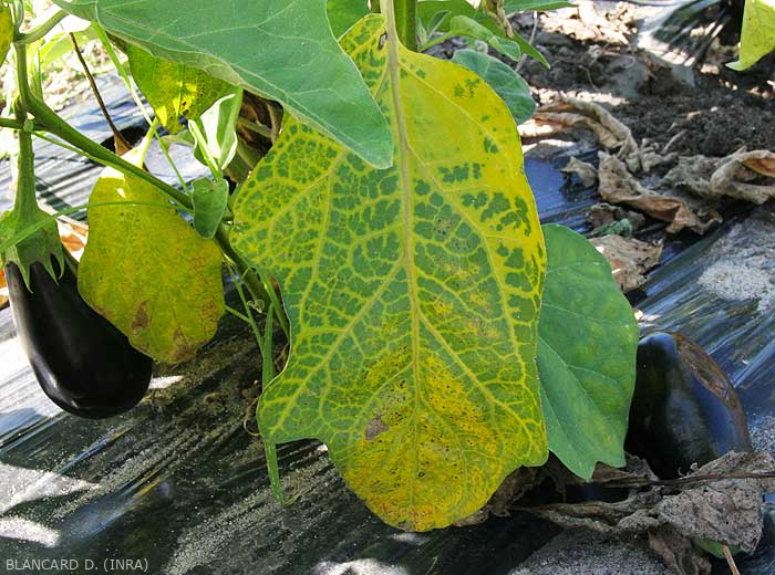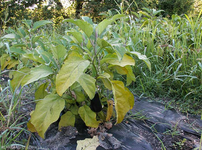 marchitamiento más o menos rápido (figura 3), amarillamiento (figuras 4 a 6), incluso necrosis de folíolos y / o hojas inferiores de las plantas;