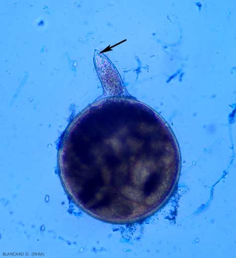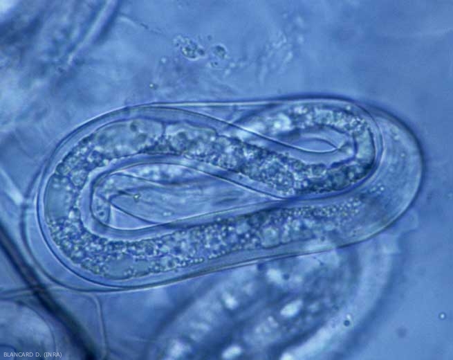 El larvas segundo instar , atraídos por exudados de la raíz y otros compuestos, introduzca las raíces y migrar al sistema vascular a través de la corteza, entre las células. Durante sus picaduras segregan enzimas que provocan migración en la raíz y el desarrollo de células gigantes que contribuirán a su nutrición. El desarrollo larvario continúa al mismo tiempo que la raíz se hincha. En última instancia, una vesícula rodea a un piriforme femenino grande (Figuras 1 y 3). Esto produce muchos huevos (300 a 3000, entre 400 y 500 en promedio) que se emiten fuera de la raíz, incrustados en una matriz mucilaginosa. Varias generaciones tienen lugar durante una temporada y la infestación puede llegar a 100.000 a 200.000 larvas / kg de suelo.