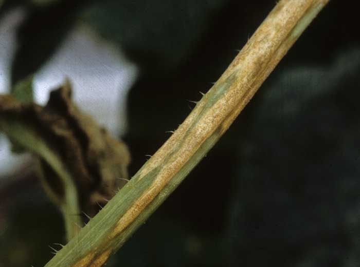 En los tallos y pecíolos , este hongo forma lesiones aceitosas más o menos alargadas y ligeramente deprimidas de las que a veces sale un exudado marrón (figura 4). Si las condiciones climáticas son favorables, estas lesiones se propagan, se fusionan y también se cubren con pequeñas masas de color rosa a naranja (figura 5). Tenga en cuenta que pueden desarrollarse en cualquier parte del tallo y los pecíolos y debilitarlos. Este es particularmente el caso cuando han dado lugar a ráfagas.