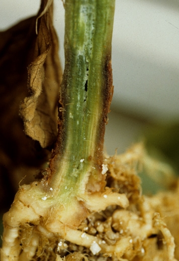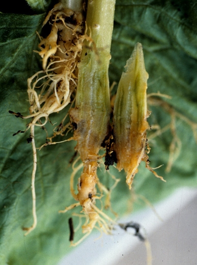 Cuando las cucurbitáceas tienen su sistema de raíces atacado por Pythium spp. o Phytophthora spp., se nota especialmente el pardeamiento, la descomposición y la desaparición de raicillas y raíces de pequeño diámetro. Las raíces principales y la raíz principal a menudo muestran lesiones húmedas de color naranja a marrón (Figura 4); a veces terminan pudriéndose más o menos localmente. El collar también puede verse afectado, mostrando lesiones húmedas, de color marrón a negruzco, que rodean el collar de las plantas jóvenes durante varios centímetros (Figuras 5 y 6). La corteza está muy alterada, a veces puede suberizarse superficialmente.
