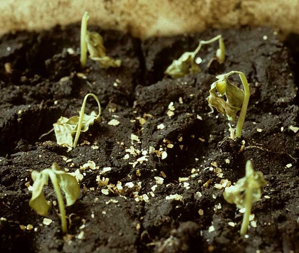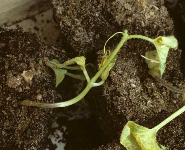 Independientemente de los síntomas primarios, las plántulas pronto se marchitan, colapsan y mueren. Eventualmente se descomponen y desaparecen por completo (amortiguación, amortiguación ).