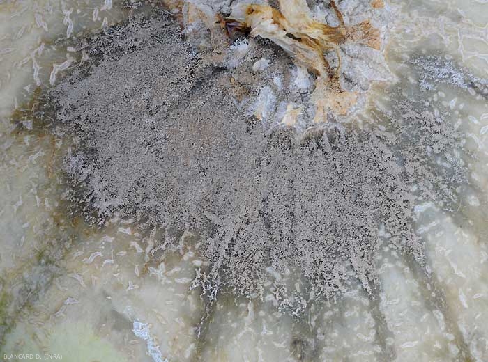 En todos los órganos atacados, B. cinerea produce, si las condiciones lo permiten, un moho gris más o menos denso (figuras 2, 3 y 6).