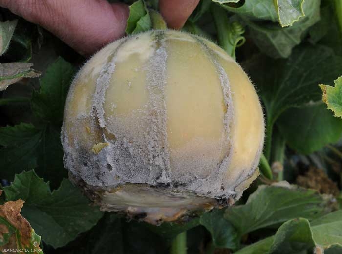 puede atacar prácticamente todos los órganos aéreos de muchas cucurbitáceas: hojas, tallos y especialmente frutos.