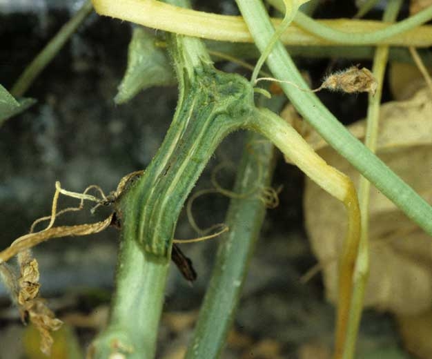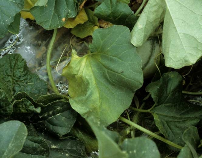 En el melón , las plantas afectadas muestran con frecuencia un ligero marchitamiento de hojas las inferiores en los momentos más calurosos del día. Inicialmente, este marchitamiento es reversible durante la noche y, a veces, se limita a un solo "lado" de la planta. Posteriormente, a medida que se desarrolla la enfermedad, se puede observar que ciertos sectores del limbo, a menudo interveinales y en forma de "V", se ablandan gradualmente y se vuelven amarillos (figuras 1 y 2). Grandes porciones de las hojas eventualmente se vuelven de color beige a marrón, luego se necrosis y se secan (Figura 3). Las hojas así afectadas pueden morir prematuramente, lo que conduce a la exposición de los frutos a la radiación solar y por tanto al riesgo de quemaduras solares . Se observaron caídas de hojas en melón en Túnez.