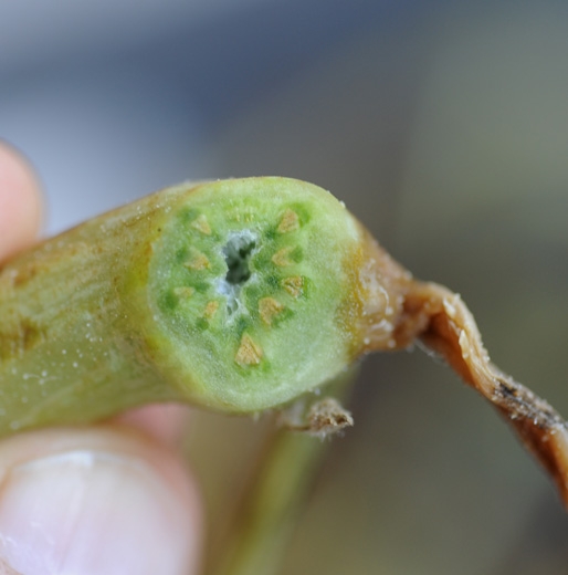 Verticillium dahliae causa una enfermedad vascular que puede desarrollarse temprano en la planta, aunque los síntomas generalmente no se observan hasta después del cuajado.