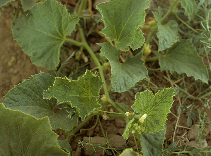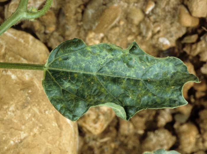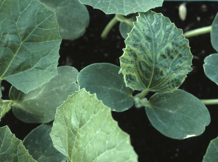 En pepino : Ciertas cepas infectan el pepino causando mosaicismo y manchas cloróticas o anulares en el follaje.