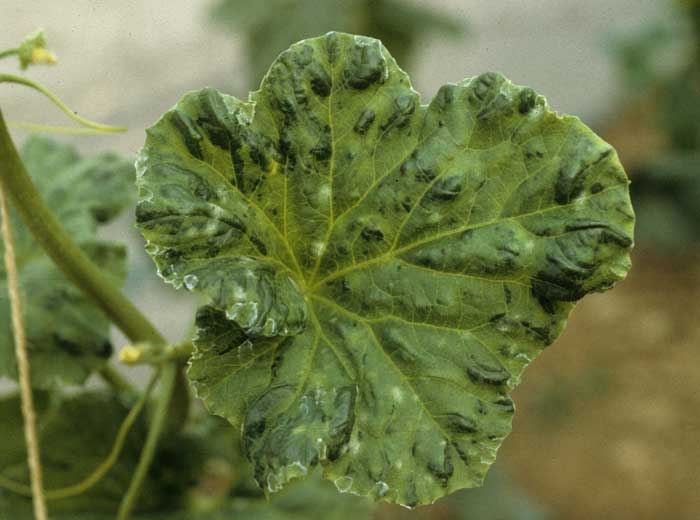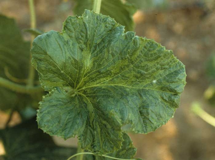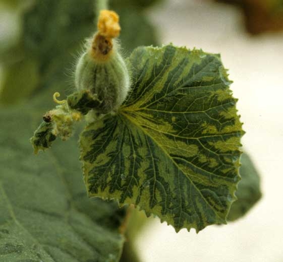 Pepino : Generalmente se observan fuertes mosaicos deformantes en el follaje y, a veces, en los frutos, y un retraso del crecimiento general de la planta.