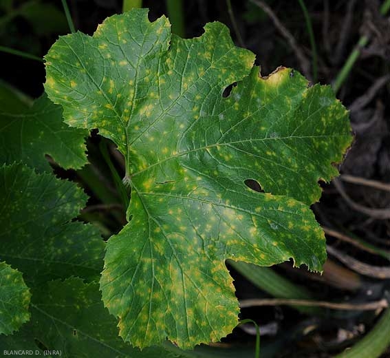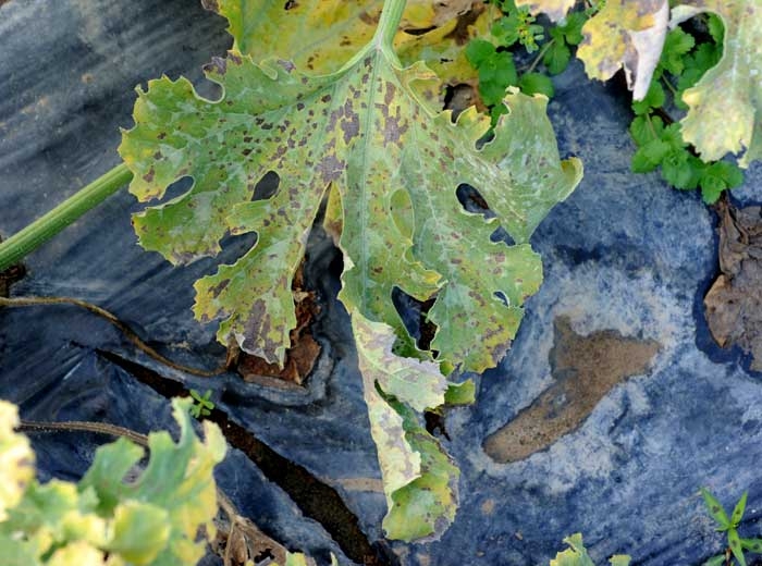 - para otras cucurbitáceas, las manchas son de forma más irregular, más bien redondeadas, como en el melón, por ejemplo. En esta planta, las manchas están húmedas al principio, luego rápidamente se vuelven amarillas y marrones. Finalmente, un borde clorótico los rodea. Estas manchas se inician a veces cerca de las venas que se vuelven marrones en una porción más o menos limitada. Durante períodos de alta humedad, el tejido afectado puede romperse y caerse.