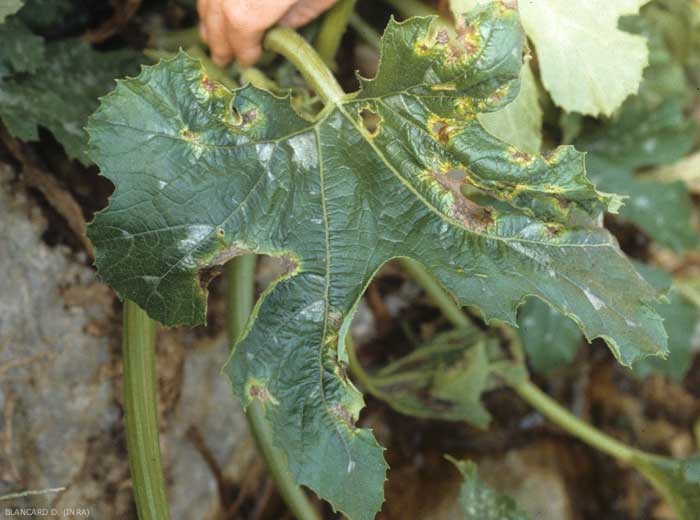 Las hojas que tocan el suelo o las proyecciones sujetas de partículas de suelo contaminadas (a través de Splash) pueden verse afectadas. En este caso, presentan manchas, o incluso áreas más o menos extensas, lívidas a amarillentas, oscureciendo, oscureciendo y necrosis con bastante rapidez (figuras 2 y 3).