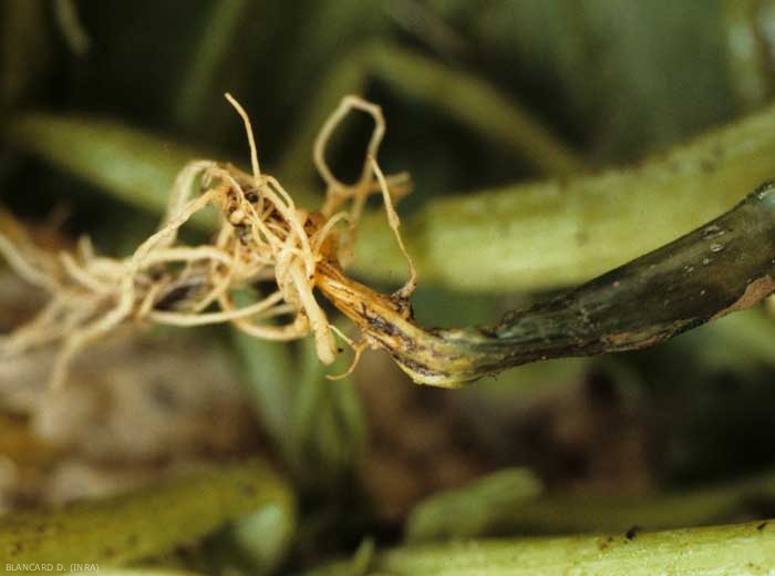 En plantas jóvenes y adultas, a veces aparece una lesión húmeda que se oscurece progresivamente en el tallo al nivel del suelo (Figura 1); esto una vez rodeado conduce a un marchitamiento más o menos irreversible de las plantas y su muerte a largo plazo. Tenga en cuenta que los vasos subyacentes a esta lesión son más o menos marrones. Las raíces pueden pudrirse, por lo que se vuelven blandas y adquieren un tinte marrón antes de descomponerse.