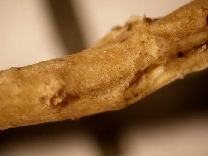 En o cerca de tejido alterado, el característico micelio marrón de este hongo puede verse en forma de filamentos aislados y discretos (Figura 3).