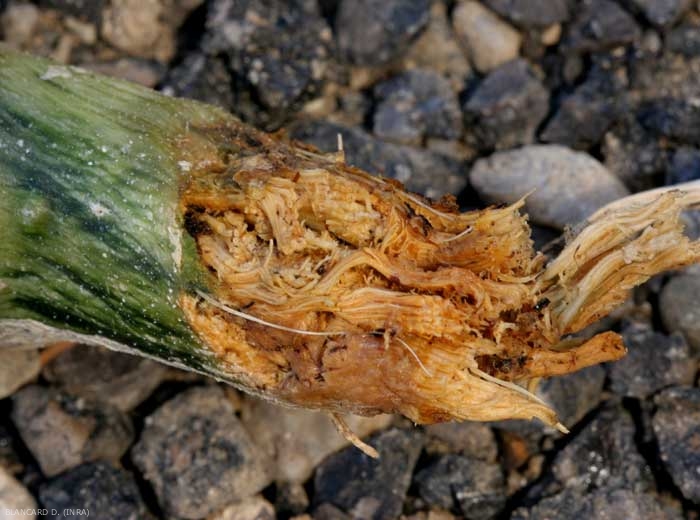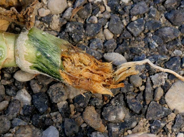 - coloración amarillenta, pardeamiento de la corteza que puede volverse blanda o suberise superficialmente. La parte inferior del tallo presente en el suelo también puede verse afectada, los tejidos de la corteza adquieren un tinte gris a verde pardo y se pudren gradualmente (Figuras 1 y 2).