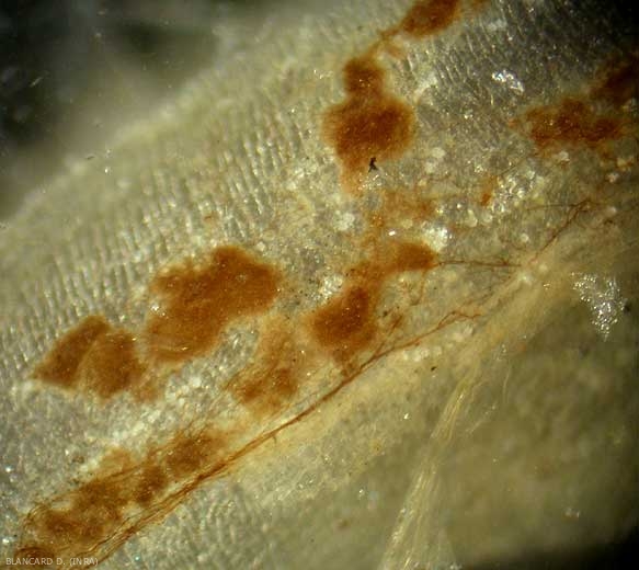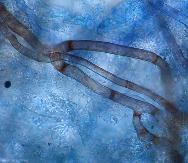 Las contaminaciones se producen a través del micelio (Figuras 1 y 2) presente en el suelo o de los esclerocios (Figura 3). Esto puede colonizar superficialmente los órganos presentes en el suelo o en contacto con él. La contaminación también puede tener lugar a través de las basidiosporas (figura 4) en algunas plantas cultivadas, no según nuestro conocimiento sobre calabacines y calabazas. En este caso, estas basidiosporas germinan y dan lugar a filamentos miceliales. Posteriormente, el micelio ingresa a los tejidos directamente a través de la cutícula o mediante diversas lesiones. Su evolución inter e intracelular suele ser muy rápida y destructiva debido a su equipamiento enzimático, pero también si encuentra condiciones climáticas favorables. Este proceso parasitario es la causa de la humectación y de las lesiones y pudriciones visibles en los distintos órganos del tomate.