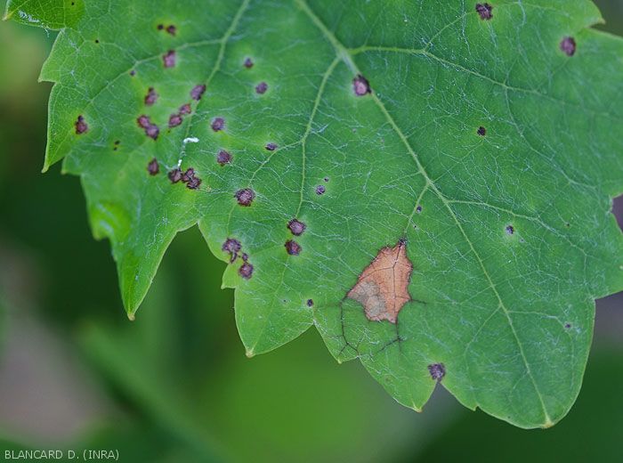 Las lesiones causadas por <i> <b> Elsinoë ampelina </b> </i> se extienden gradualmente. La hoja está más o menos deformada en las partes afectadas por las numerosas manchas.