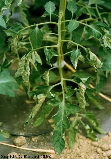 Este foliolo de tomate está cubierto de pequeñas lesiones cloróticas circulares de algunos milímetros de diámetro, en relieve en la superficie superior del limbo, a veces concentradas cerca de determinadas venas. <b> Intumescencias </b> (edema)
