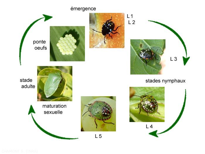 Insectos heterometábolos, las chinches se desarrollan en 5 estadios larvales antes de la madurez sexual (Figura 7) que ocurre sin pupa. Dependiendo de la especie, las chinches hibernan en varias etapas de su crecimiento (huevo, pupa o adulto). La forma de los huevos, su ubicación y su disposición son generalmente características de los diferentes géneros. Estos huevos se ponen solos o en grupos, pueden depositarse en la superficie de las plantas (figura 8) o insertarse dentro de un tallo o debajo de la corteza.