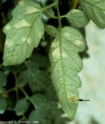 Passalora fulva s'attaque essentiellement aux folioles qui montrent d'abord des taches vert pâle à la face supérieure du limbe (figure 1). Celles-ci atteignent plusieurs millimètres de diamètre et présentent un contour estompé ; elles finissent par prendre une teinte jaune plus ou moins intense. À la face inférieure du limbe, à leur emplacement, un velouté brun violacé à gris les recouvre (figures 2 et 3) ; il est en fait constitué de conidiophores sortant par les stomates et portant des conidies brunâtres (figures 6 et 7). Dans le cas de fortes attaques, le champignon peut sporuler sur la face supérieure du limbe (figure 4). Dans ce cas, les feuilles jaunissent entièrement (et se dessèchent.