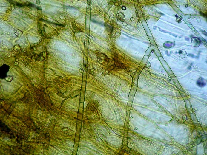 En los tejidos dañados o cerca de ellos, a veces hay discretos de filamentos color blanquecino a marrón (Figuras 3 y 7) que se extienden a lo largo del tallo, las nervaduras y de una hoja a otra. A veces se localizan masas marrones mal definidas a lo largo de las venas (Figura 8).