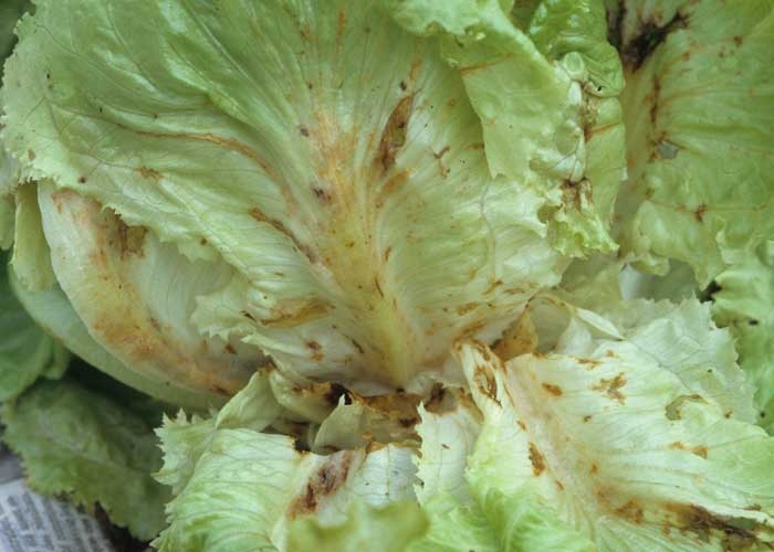 Plusieurs déprédateurs sont responsables d'altérations plus ou moins orangées sur le limbe des salades. Nous avons volontairement intégré ces altérations sous cette rubrique car elles prêtent parfois à confusion avec les autres symptômes étudiés dans cette partie.