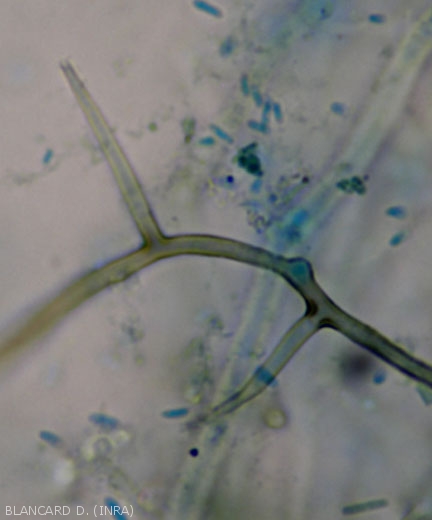 - Los conidióforos son simples y cilíndricos, de color verde parduzco y de paredes gruesas en su base, su color es más claro en su punta. Están coronados por una célula conidiógena (fialida) más ligera, ampuliforme y alargada, rematada por un collar (figuras 1, 2 y 4). Los conidios son subhialinos, oblongo-elipsoide obovados a la derecha, agrupados en glomérulos. Miden 3-4 x 1-1,5 micrómetros (Figura 2). De clamidosporas globulares a subglobulares (Figura 3), oliva a verde oscuro (7-15 micrómetros de largo), aisladas o en cadenas cortas se forman en más o menos dependiendo de las cepas.