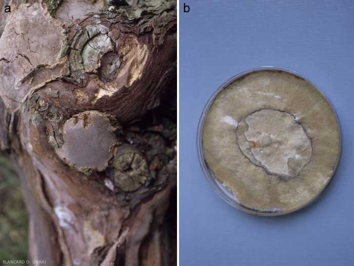 Fomitiporia mediterranea es un basidiomiceto descrito como una nueva especie asociada a esca en viñedos mediterráneos, responsable de la degradación terminal de la madera ("podredumbre blanca" o descomposición). Su fructificación en la vid es idéntica a la producida por Fomitiporia punctata (phellin manchado). Es por esta razón que en el pasado se han producido confusiones de identificación. Estos dos hongos forman adheridos a la carpóforos madera (Figura 10), planos y completamente reabastecidos, pulvinados, con un margen más claro. De color beige a marrón, pueden alcanzar varios centímetros de diámetro y milímetros de grosor en la vid.