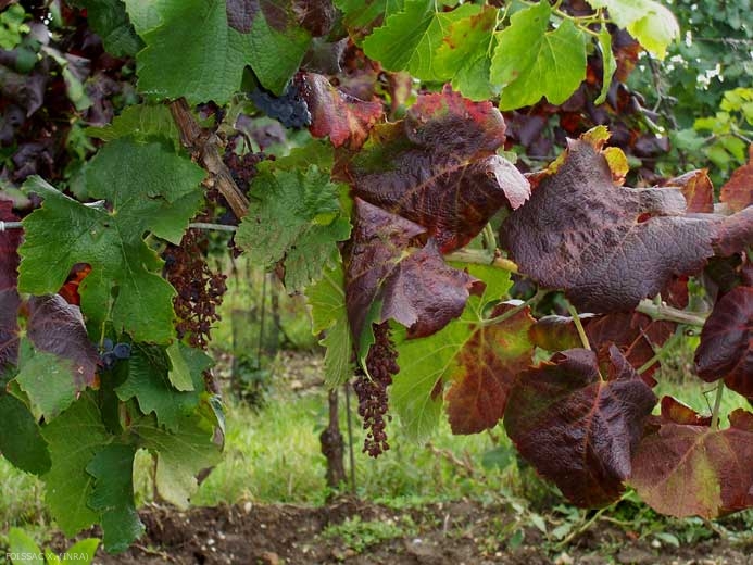 - en el envero , las láminas foliares se endurecen y se vuelven quebradizas, se decoloran (las uvas blancas se vuelven amarillas, las tintas se vuelven rojas) (figuras 2 y 3) y se rizan más o menos según la variedad de uva. Los racimos pueden mostrar que las bayas se secan a partir del tallo. Si nos interesa la calidad organoléptica de las bayas producidas por las vides enfermas, son fibrosas lo que les da un sabor amargo y agrio. Es obvio que el vino producido posteriormente es de mala calidad y, a menudo, difícil de comercializar.