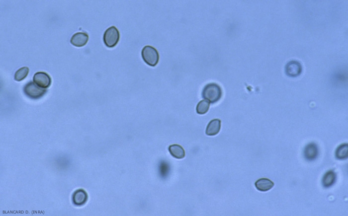 Es a partir de estos esporangios que se producen las esporangiosporas celuladas, hialinas a marrones. Estas esporas, redondas a ovoides (4-11 µm de diámetro), tienen una superficie ligeramente estriada (figura 8).