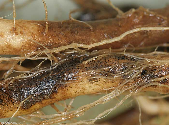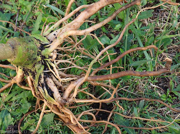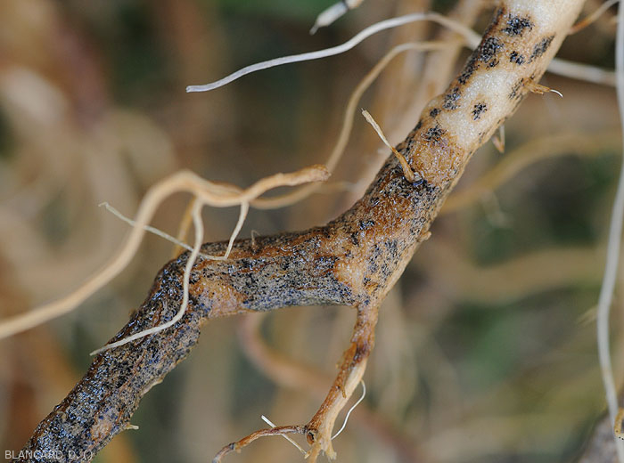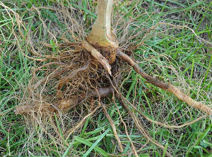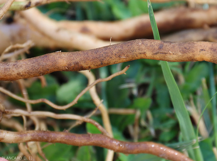 Las raicillas son pocas o inexistentes porque una podredumbre cortical marrón las ha destruido. La corteza de las raíces principales presenta lesiones de color marrón oscuro, más o menos suberizadas.