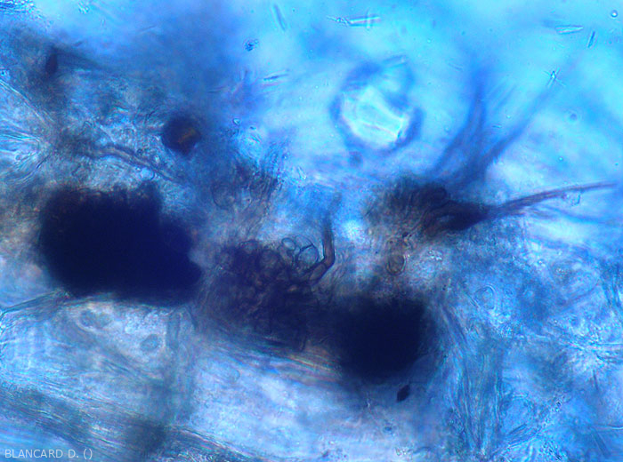 produce acérvulos intra o subepidérmicos, materializando su multiplicación asexual (figuras 1 a 3), así como numerosos esclerocios de color marrón oscuro a negro.