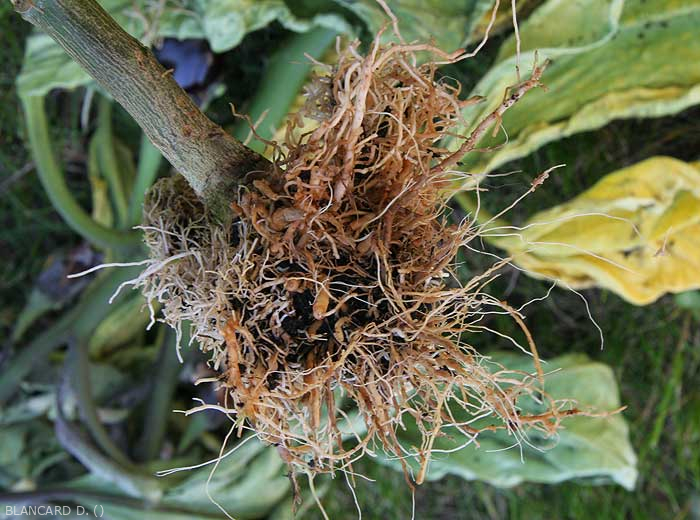 - Pardeamiento y / o pudrición de las raíces pivotantes y las raíces laterales en el suelo y en el suelo ( pudrición de la raíz ). Pardeamiento, descomposición y desaparición de raicillas y raíces de pequeño diámetro. La corteza de las raíces principales y la raíz primaria también eventualmente se pudren más o menos localmente. Los tejidos vasculares opuestos a las áreas alteradas eventualmente se vuelven marrones (xilema).