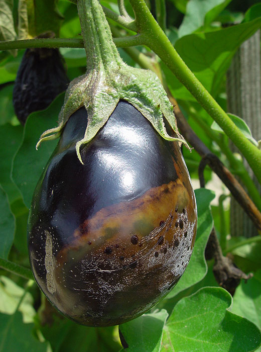 - Lesiones marrones y húmedas alrededor de los tallos, pudrición húmeda en hojas y frutos de berenjena.