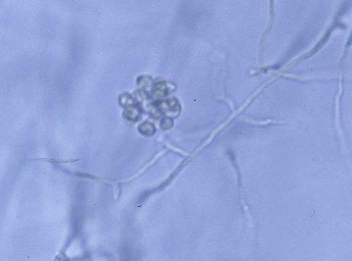 La observación al microscopio fotónico permite a menudo observar la presencia de estructuras características de <i> Pythium </i>: micelio, oogonia (ornamentada en este caso), esporangios. <b>