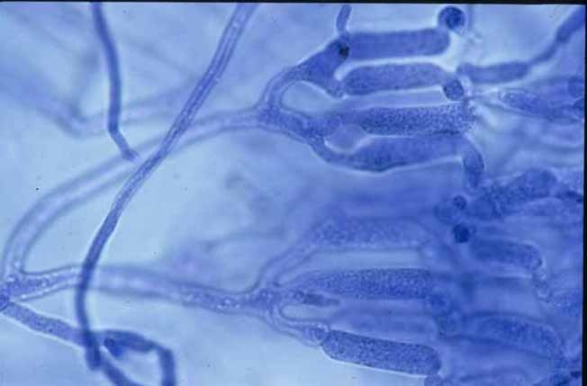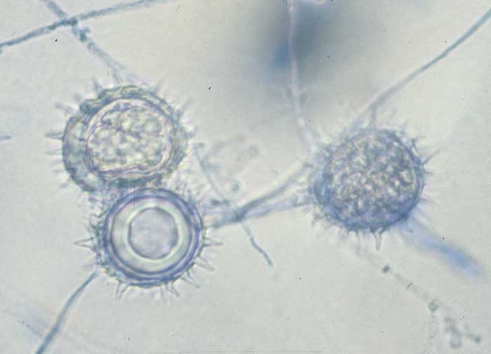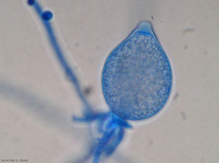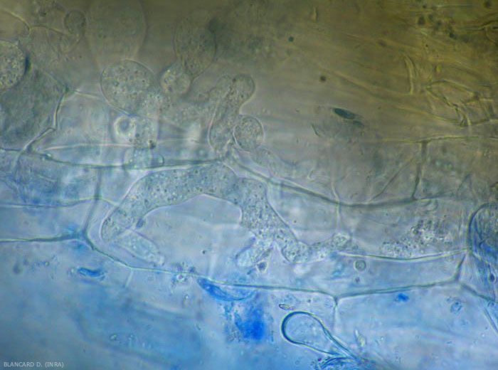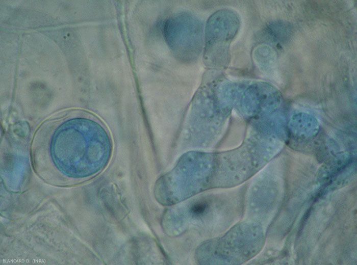 - Présence de sporanges, d'oospores et/ou de chlamydospores dans et parfois sur les tissus altérés.