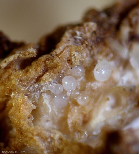 - Femelles hypertrophiées avec leur masse d'oeufs peuvent être discernées dans les galles (Meloidogyne spp.), ou former des kystes (Heterodera spp., Globodera spp., etc.) ;