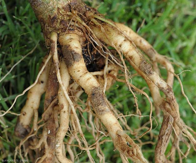 - Altérations racinaires brunes et lisses devenant superficiellement liégeuses sur le cortex ; celles-ci ceinturent progressivement les racines qui présentent à terme des manchons plus ou moins renflés, craquelés et d'apparence sèche ;