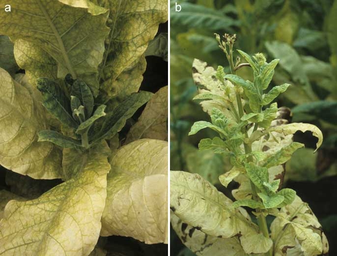 En général, le stolbur commence à se manifester dans le courant du mois d'août, à l'approche de la floraison des tabacs. A ce moment de la culture, les tabacs sont écimés et les bourgeons axillaires sont inhibés chimiquement. La maladie se traduit alors par l'apparition de jaunissements d'abord entre les nervures survenant le plus souvent sur les vieilles feuilles ou les feuilles intermédiaires et gagnant progressivement l'ensemble de la plante (figures 1 et 2). Dans le cas des tabacs bruns, des nécroses nervaires et inter-nervaires accompagnent parfois une légère chlorose du limbe ; le syndrome obtenu peut être confondu avec celui provoqué par certaines souches nécrotiques de PVY (figure 3). Par la suite, la décoloration est telle que le limbe devient totalement blanc. Ce symptôme est peut-être à l'origine de ce que les anciens tabaculteurs observaient parfois et dénommaient les "pieds blancs" (figure 4). Cette anomalie de coloration n'est pas le symptôme le plus caractéristique ; par contre, elle a pu être à l'origine de nombreuses confusions avec ceux occasionnés par des désordres nutritionnels.