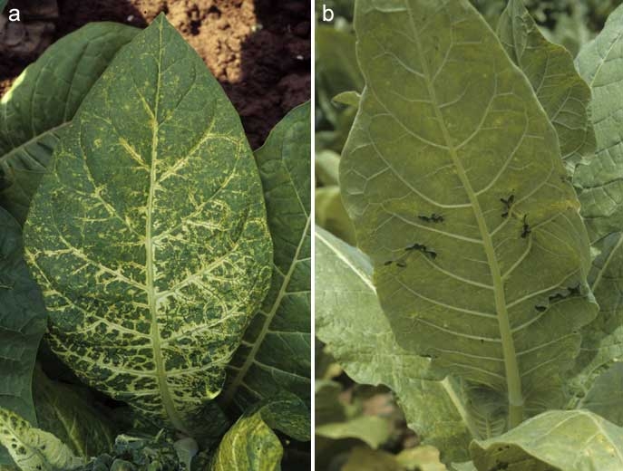 - le virus de la mosaïque de la luzerne (Alfafa mosaic virus, AMV), qui se manifeste plus particulièrement dans des cultures de tabac à proximité de luzernières. Ce virus est transmis par pucerons selon le mode non persistant. Les plantes atteintes sont souvent isolées ou regroupées en foyer de quelques plantes dans la parcelle. Les infections par l'AMV sont à l'origine de symptômes foliaires assez variés sur tabac, faisant intervenir divers motifs présentant fréquemment une coloration jaune vif. Ainsi, certaines souches d'AMV produisent des anneaux, des arcs et des arabesques plus ou moins régulières, jaune pâle à blanc, parfois nécrotiques, ainsi que de larges plages jaune vif sur les feuilles de tabac (figures 1 à 4). On peut aussi observer des énations à la face inférieure du limbe (figure 3b). Signalons que les tabacs cultivés en France ne disposent pas de résistance variétale à ce virus (Virus de la mosaïque de la luzerne) ;