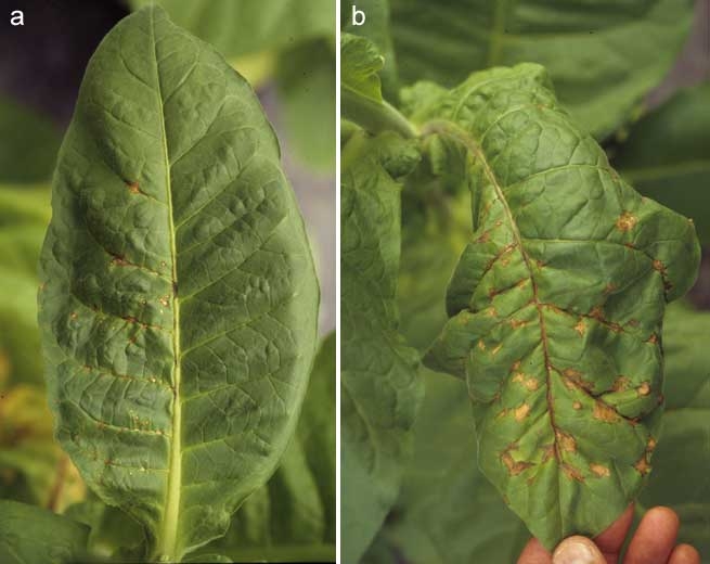 - le virus de la gravure du tabac (Tobacco etch virus, TEV) qui est un Potyvirus comme le PVY. On observe sur les jeunes feuilles un éclaircissement du limbe ("vein clearing"), une marbrure, des arabesques nécrotiques, des taches chlorotiques internervaires devenant nécrotiques, ainsi que des nécroses des nervures des feuilles basses (figure 5). On peut aussi parfois observer un rabougrissement des plantes. Plusieurs espèces de pucerons (Myzus persicae, Myzus nicotianae, Macrosiphum spp....) transmettent ce virus selon le mode non persistant (Virus de la gravure du tabac).