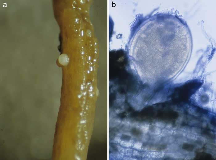 Plusieurs sous-espèces de Globodera ont été signalées sur tabac de par le monde. En France, seul Globodera tabacum sensu stricto semble sévir. Ce nématode à kystes est essentiellement localisé dans quelques parcelles du Sud-Ouest de notre pays. Sa présence sur les racines est matérialisée par les nombreux kystes immatures ou matures parsemant les racines (figures 1 à 3). Ceux-ci ont une taille variable en fonction des espèces. Dans tous les cas, les tabacs affectés présentent une croissance réduite.
