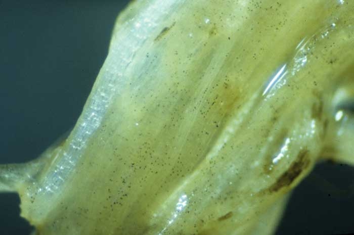 D'autres microorganismes aquatiques apparentés aux champignons et appartenant aux oomycètes ou aux chytridiomycètes révèlent des comportements comparables à ceux d'Olpidium brassicae, mais seulement dans les semis flottants (figures 4 et 5). Leur identification est assez malaisée. Certaines de leurs structures ne sont pas sans rappeler celles qui matérialisent la présence de Rhizophydium ou d'autres organismes aquatiques. Plusieurs d'entre eux ont déjà été observés dans les racines de quelques espèces de Nicotiana, en particulier N. tabacum : Lagenocystis radicicola (Vanterp. et Ledingham) H.F. Copel. (1956) (anc. Lagena radicicola) et Rhizophydium graminis Ledingham (1936).
