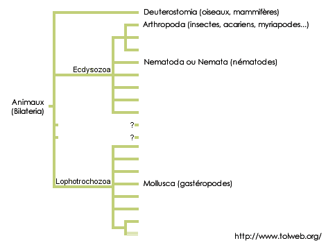 Afin de vous aider à replacer les différents grands types de ravageurs dans le monde des animaux, nous vous proposons un schéma phylogénétique (figure 1) réalisé à partir des analyses basées sur des données moléculaires (séquences 18S de l'ARN ribosomique). Pour replacer les animaux dans l'arbre de vie, consulter ce lien.