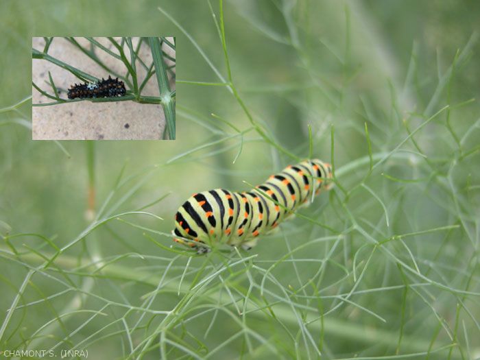 - les Papilionidae comprenant des papillons aux grandes ailes assez colorées comme le machaon, dont la chenille consomme les feuilles de fenouil et autres ombellifères (Apiaceae) ou le flambé dont la chenille se nourrit sur l'aubépine et autres rosacées ligneuses (figures).