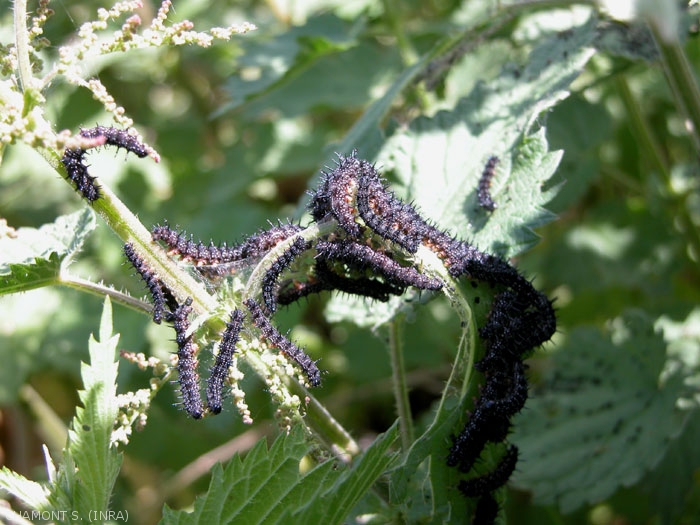 - les Nymphalidae qui forment une très vaste famille qui comprend des papillons familiers comme la petite tortue ou vanesse de l'ortie (figure), le tabac d'Espagne, le paon du jour (figure), etc. Les papillons, diurnes, marchent sur 4 pattes (la paire antérieure n'est pas fonctionnelle). Les chenilles sont phytophages (orties par exemple, ou arbustes) et portent généralement des épines (figure).