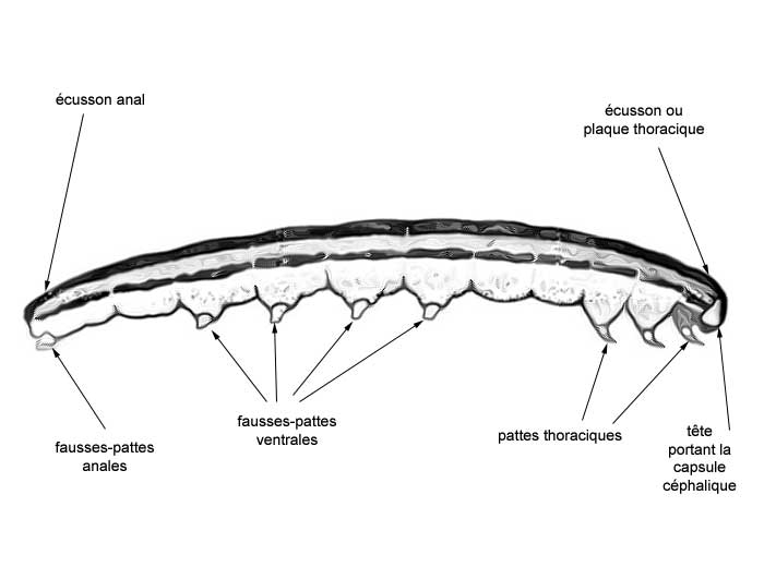 Les chenilles ont trois paires de pattes thoraciques relativement peu développées, quatre paires de fausses pattes abdominales et une paire de pattes anales à l'extrémité de l'abdomen. Les fausses pattes peuvent manquer comme chez les Geometridae ou les mineuses. Les chenilles ont des pièces buccales broyeuses et se nourrissent principalement de feuilles, tiges, racines ou fruits et donc peuvent faire d'importants dégâts dans les cultures, les vergers et les forêts et leur activité déprédatrice peut être spectaculaire quand ces chenilles pullulent.