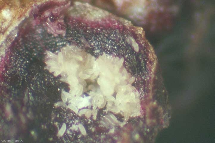 Les larves colonisent la base des pousses de l'année et piquent les tissus cicatriciels correspondant aux bases d'insertion des écailles des bourgeons.
